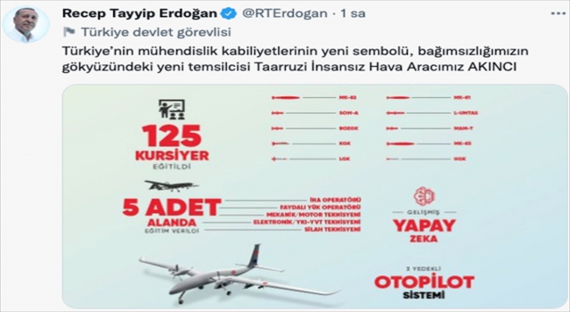 ANKARA (AA) Cumhurbaşkanı Recep Tayyip Erdoğan, Baykar tarafından yerli ve milli imkanlarla geliştirilen ve Türk Silahlı Kuvvetleri envanterine giren Bayraktar AKINCI Taarruzi İnsansız Hava Aracının (TİHA) özelliklerinin yer aldığı grafik paylaştı.