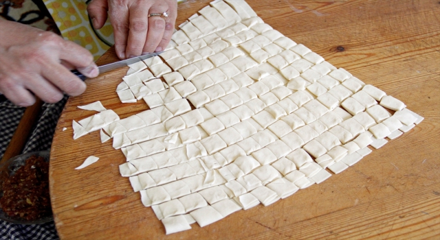 Yumurta, tuz ve su karışımına un eklenerek yapılan sert mantı hamuru, kadınlarca "beze" adı verilen parçalara ayrılıyor. Oklava ile açılan hamurdan 1'er santimetre genişliğinde şeritler kesiliyor ve yine aynı ölçüde kare hamurlar elde ediliyor.