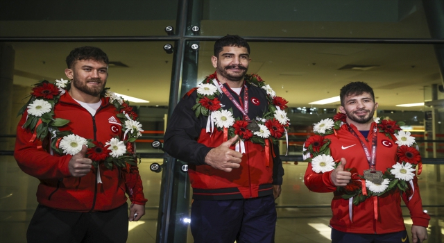 Altın madalya kazanan Taha Akgül ve Süleyman Atlı, gümüş madalya kazanan Süleyman Karadeniz ile takım yetkilileri, hava yoluyla İstanbul aktarmalı olarak Ankara Esenboğa Havalimanına geldi.