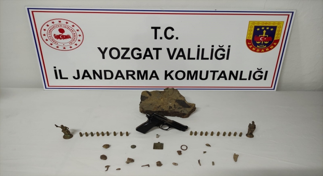 YOZGAT (AA) Yozgat'ta tarihi eser niteliği taşıdığı değerlendirilen 2 heykel, 1 sikke, 16 obje ve üzerinde yaprak fosili bulunan kaya parçası ele geçirildi, bir zanlı gözaltına alındı.