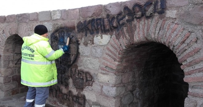 Büyükşehir ekipleri, Ankara’yı 360 derece seyir imkanı veren tarihi burçlar ile surlara, duyarsız kişiler tarafından sprey boyalar kullanılarak yazılan yazıları silerek, görüntü kirliliğini tamamen ortadan kaldırdı.
