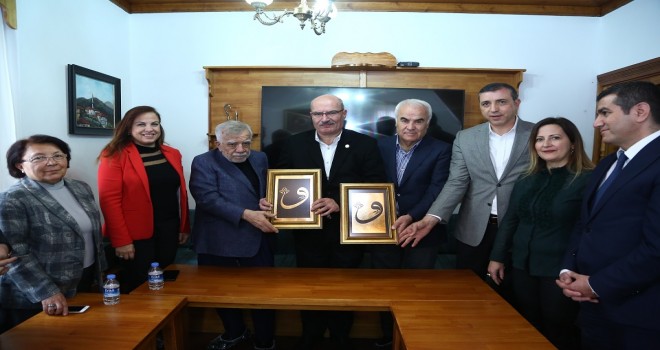 Başkent Ankara Meclisi Başkanı Nevzat Ceylan ve Başkan Yardımcısı Sanem Arıkan tarafından ATO Başkanı Gürsel Baran’a Ankaralı Deri kesme hat sanatçısı Murat Ateş tarafından yapılan “Vav” tablosu hediye edildi.