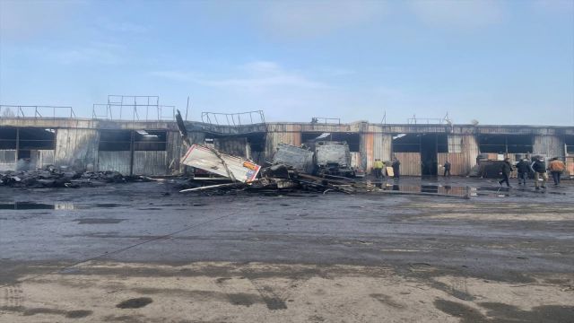 10 dükkan ve 3 tırın kullanılamaz hale geldiği yangın, itfaiye ekiplerinin uzun uğraşları sonucu söndürüldü.