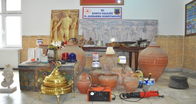 Konya'nın Akşehir ilçesinde, Jandarma ekiplerince düzenlenen operasyonda, sahte olduğu belirlenen obje ve heykelleri tarihi eser olarak satmak istedikleri iddia edilen 2 şüpheli gözaltına alındı.