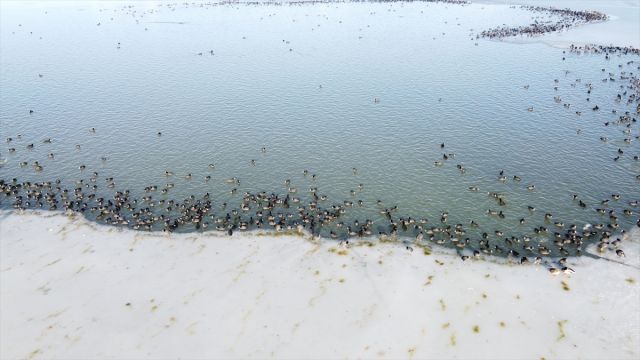 Sakar mekelerin, buz tutmasını önledikleri bu dar alanda sürü halinde yüzmesi havadan da görüntülendi. Göl sularında sürüler halinde gözlenen yüzlerce sakar mekeden bazılarının da buz kütlelerinin üzerine çıktığı görüldü.