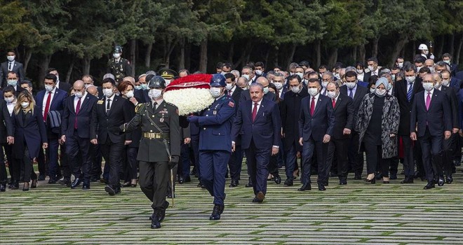 Törende, TBMM Başkanı Mustafa Şentop'un Atatürk Anıtı'na kırmızı ve beyaz karanfillerden oluşan çelenk bırakmasının ardından saygı duruşunda bulunuldu, İstiklal Marşı okundu.
