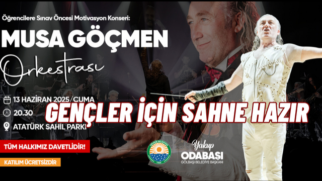 Gölbaşı Belediye Başkanı Yakup Odabaşı, YKS ve LGS’ye hazırlanan öğrencilere verdiği konser sözünü yerine getiriyor. Öğrencilere sınav öncesi moral ve motivasyon sağlamak amacıyla düzenlenen konser etkinliği, 13 Haziran Cuma akşamı saat 20.30’da Atatürk Sahil Parkı’nda gerçekleşecek. Ünlü orkestra şefi Musa Göçmen ve ekibi, Gölbaşılılarla buluşacak.