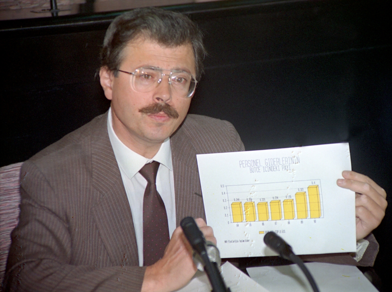 Sekizinci Cumhurbaşkanı Turgut Özal'ın danışmanlığını da yapan eski bakanlardan Adnan Kahveci'nin şüpheli bir trafik kazasıyla hayatını kaybetmesinin üzerinden 29 yıl geçti. Dönemin Maliye ve Gümrük Bakanı Kahveci (sağda) 7 Ocak 1991'de Akhisar'da bir tütün üreticisinin ürün satış belgesini imzalamıştı. (Arşiv)