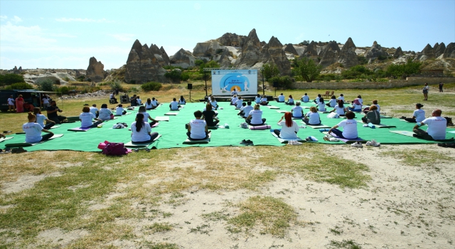 Göreme beldesindeki Zemi Vadisi girişinde gerçekleştirilen programda, Türk ve Hindistanlı davetliler platformun kurulduğu alanda kendileri için hazırlanan matların üzerinde yoga eğitmeni yönetiminde 45 dakika boyunca egzersiz yaptı.