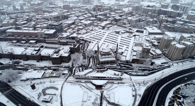 Selçuklu ve Osmanlı eserlerinin yer aldığı meydanda kar güzelliği yaşandı.