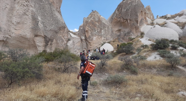 NEVŞEHİR (AA) Nevşehir'in Göreme beldesinde fotoğraf çekerken düşerek kayalıklara sıkışan kadın turist AFAD ekiplerince kurtarıldı.