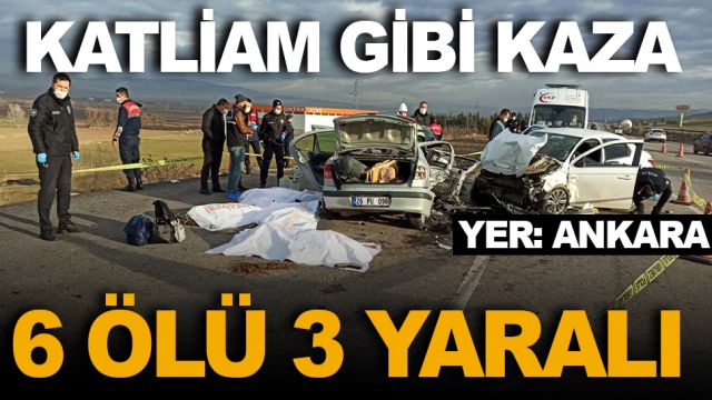 Ankara'nın Kahramankazan ilçesinde iki otomobilin kafa kafaya çarpıştığı kazada 6 kişi hayatını kaybetti, 3 kişi yaralandı. Aynı araçta yaşamını yitiren 5 kişinin bir akrabalarının cenazesine katılmak için Eskişehir'den ilçeye geldiği belirtildi.