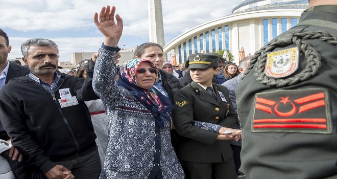 Şehidin naaşı kortej eşliğinde taşınırken annesi "Peygamberimize komşu ol kuzum." diye seslendi, nişanlısı ise cenaze törenine gelinliğiyle geldi.